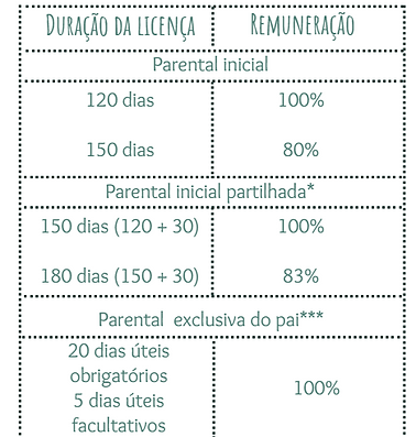 * Desde que, após o gozo das 6 semanas pela mãe, tanto o pai como a mãe gozem, cada um e em exclusivo, um período de 30 dias seguidos ou dois períodos de 20 dias seguidos